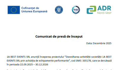 ACTUALITATE: Comunicat de presă de început. 1A BEST EVENTS SRL anunță începerea proiectului ”Dezvoltarea activității societății 1A BEST EVENTS SRL prin achiziția de echipamente performante”