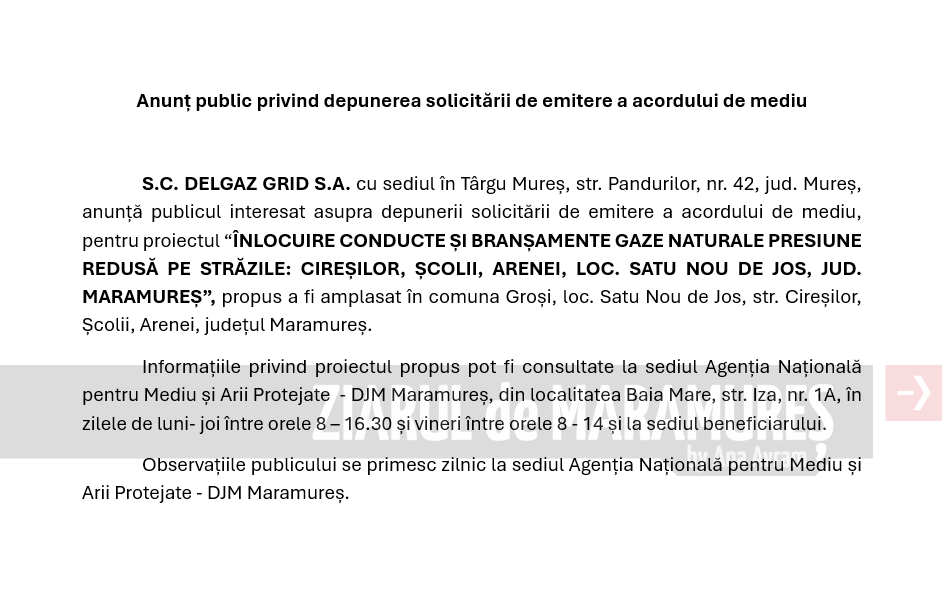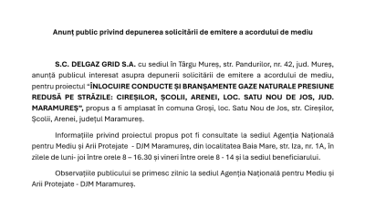 ACTUALITATE: Anunț public privind depunerea solicitării de emitere a acordului de mediu