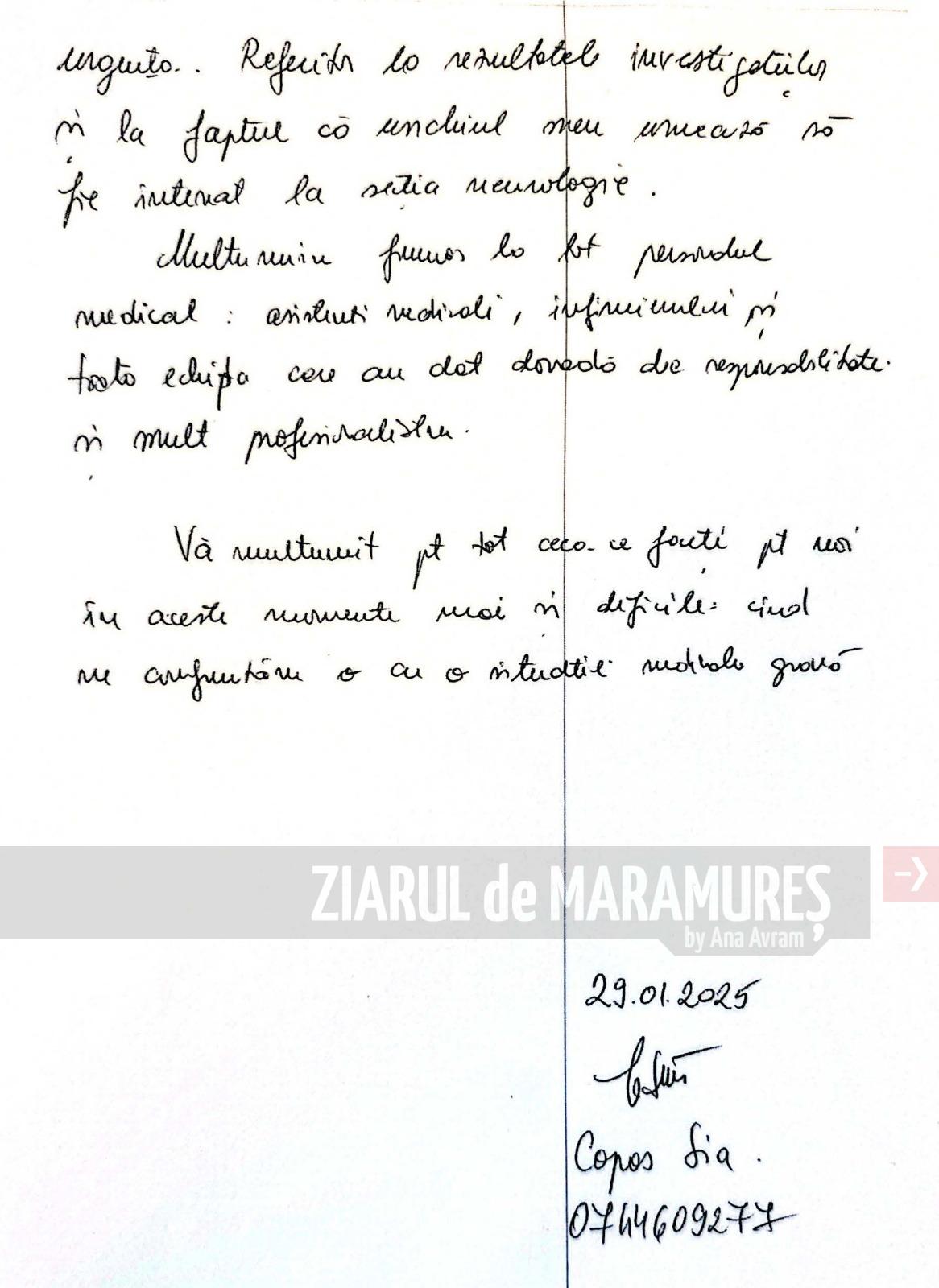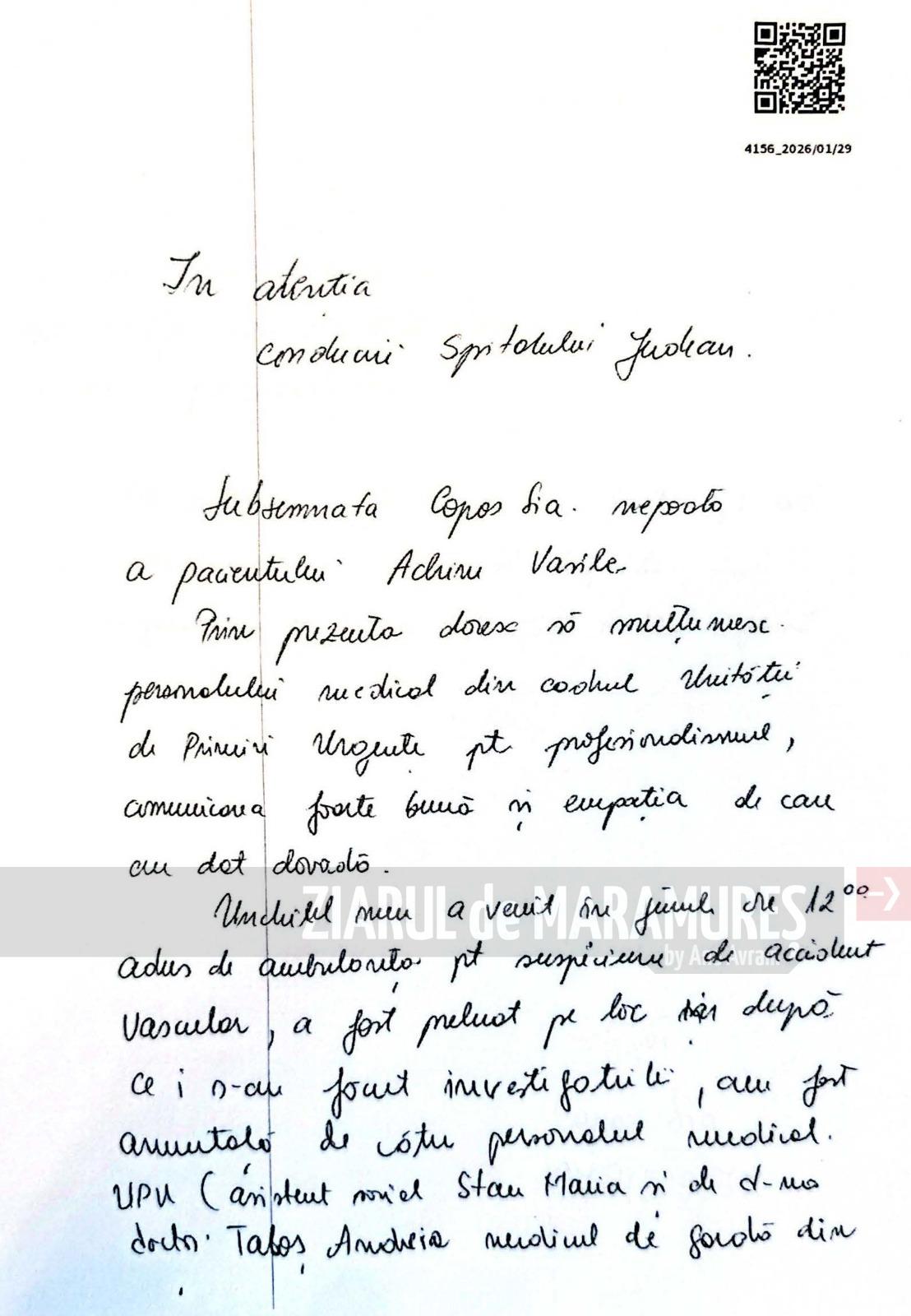 Conducerea Spitalului Județean de Urgență „Dr. Constantin Opriș” Baia Mare a primit, în data de 29 ianuarie, două scrisori scrise de mână, prin care aparținători ai unor pacienți își exprimă recunoștința față de cadrele medicale și personalul spitalului. Cele două mesaje nu sunt plângeri sau solicitări, ci simple mulțumiri, formulate dintr-un loc profund sincer și emoționant. (FOTO SCRISORI JOS!)