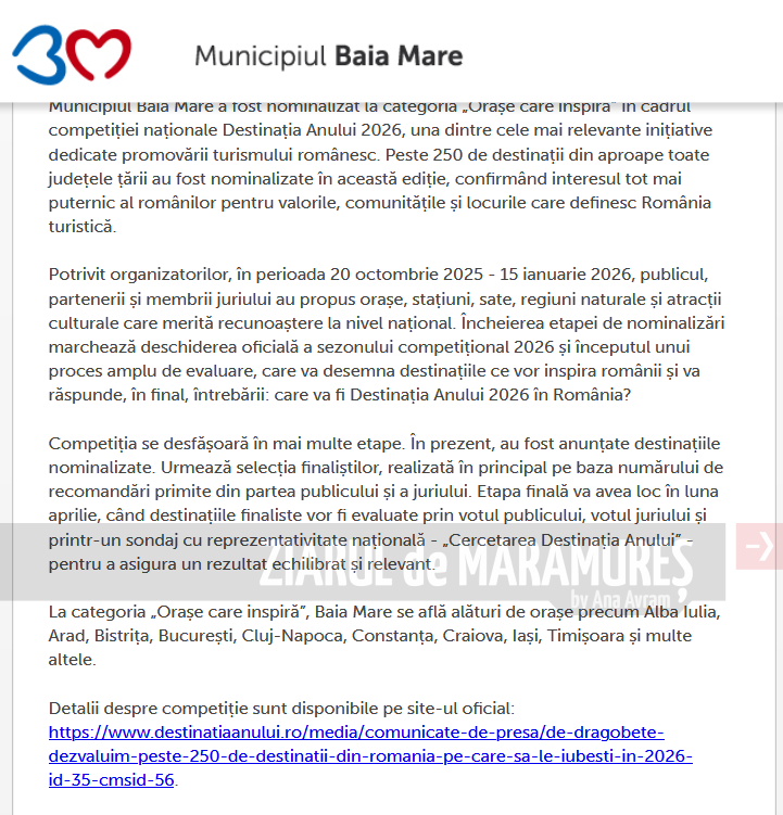 CLICK:Baia Mare, printre municipiile nominalizate la categoria ”Orașe care inspiră” în competiția Destinația Anului 2026