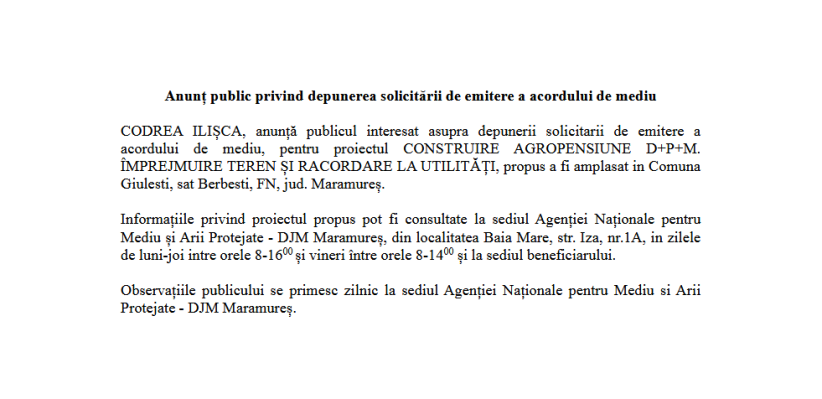 CODREA ILIȘCA, anunță publicul interesat asupra depunerii solicitarii de emitere a acordului de mediu, pentru proiectul CONSTRUIRE AGROPENSIUNE D+P+M. ÎMPREJMUIRE TEREN ȘI RACORDARE LA UTILITĂȚI, propus a fi amplasat in Comuna Giulesti, sat Berbesti, FN, jud. Maramureș.