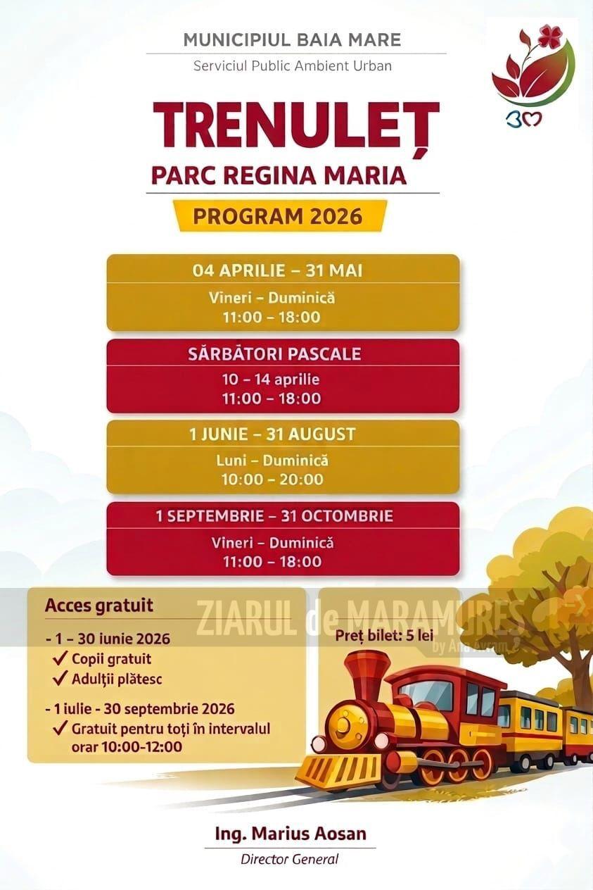 Din acest weekend, mai exact de sâmbătă, 4 aprilie 2026, trenuletul copiilor reintră pe linia ferată din Parcul Regina Maria. Astfel, cei mici vor putea să se bucure de o plimbare cu trenuletul.