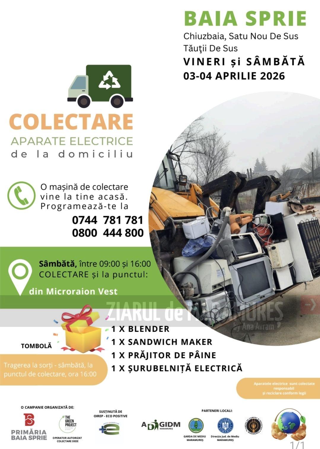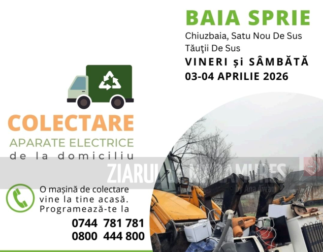 UAT Baia Sprie anunță derularea unei campanii de colectare a deseurilor electrice care se va desfăsura vineri – 3 aprilie 2026 si sâmbătă – 4 aprilie 2026 în Chiuzbaia, Satu Nou de Sus si Tăuții de sus.