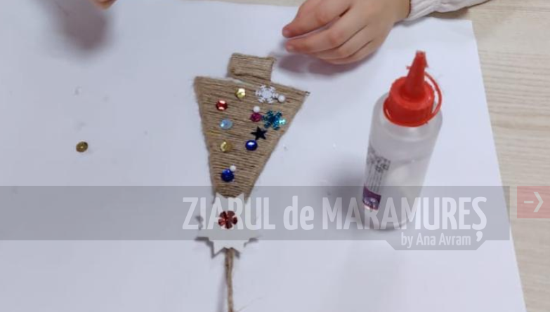 Copiii au creat decorațiuni de Crăciun în forma unor brazi, folosind funie și mărgele colorate. Cu multă răbdare, au lipit mărgelele, iar apoi au modelat funia astfel încât să capete forma perfectă a unui brăduț.