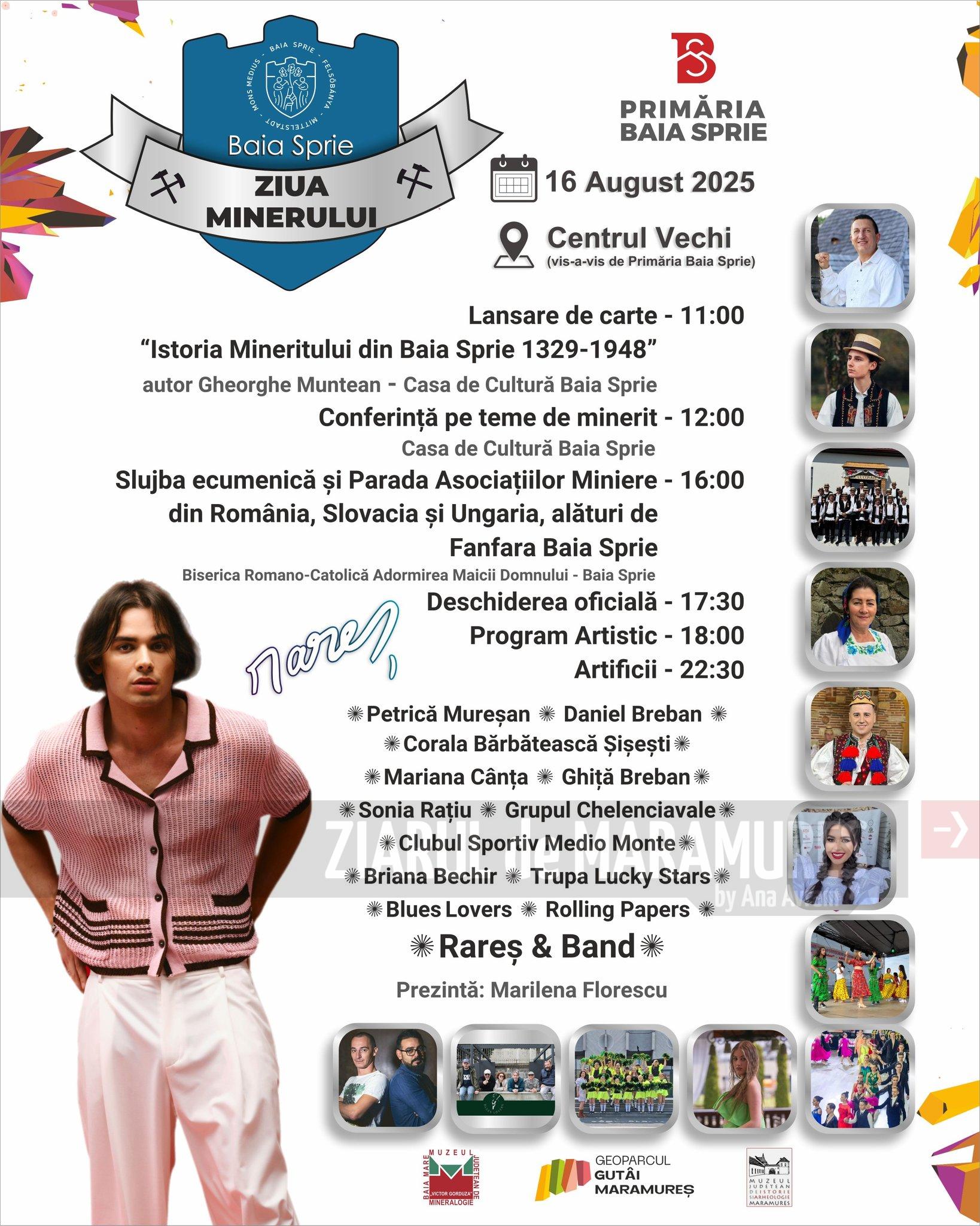 Pe 16 august marcăm împreună Ziua Minerului, ediția a II-a, un eveniment drag sufletului nostru care cinstește trecutul minier al fiecărei familii din Baia Sprie. Dorim să punem în valoare patrimoniul istoric valoros pe care ne clădim identitatea locală și facem asta alături de partenerii noștri, asociații miniere din Slovacia și Ungaria care ne sunt invitați. Pentru prima oară în orașul nostru vom avea o paradă oficială a orașelor miniere din aceste țări, alături de minerii de la minele Baia Sprie și Băiuț, constituiți în Asociația Mineritului Maramureșean. Vom participa cu toții la o slujbă ecumenică festivă găzduită de Biserica Romano-Catolică unde vom onora memoria celor care au muncit în mină, tați și bunici ai noștri.