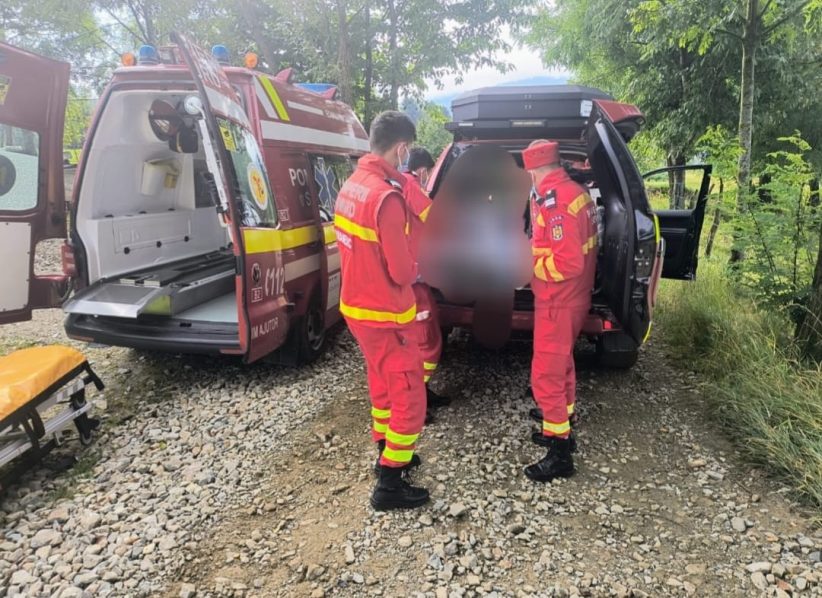 Din cauza terenului dificil, transportul pacientului la ambulanță a necesitat intervenția salvamontistilor.