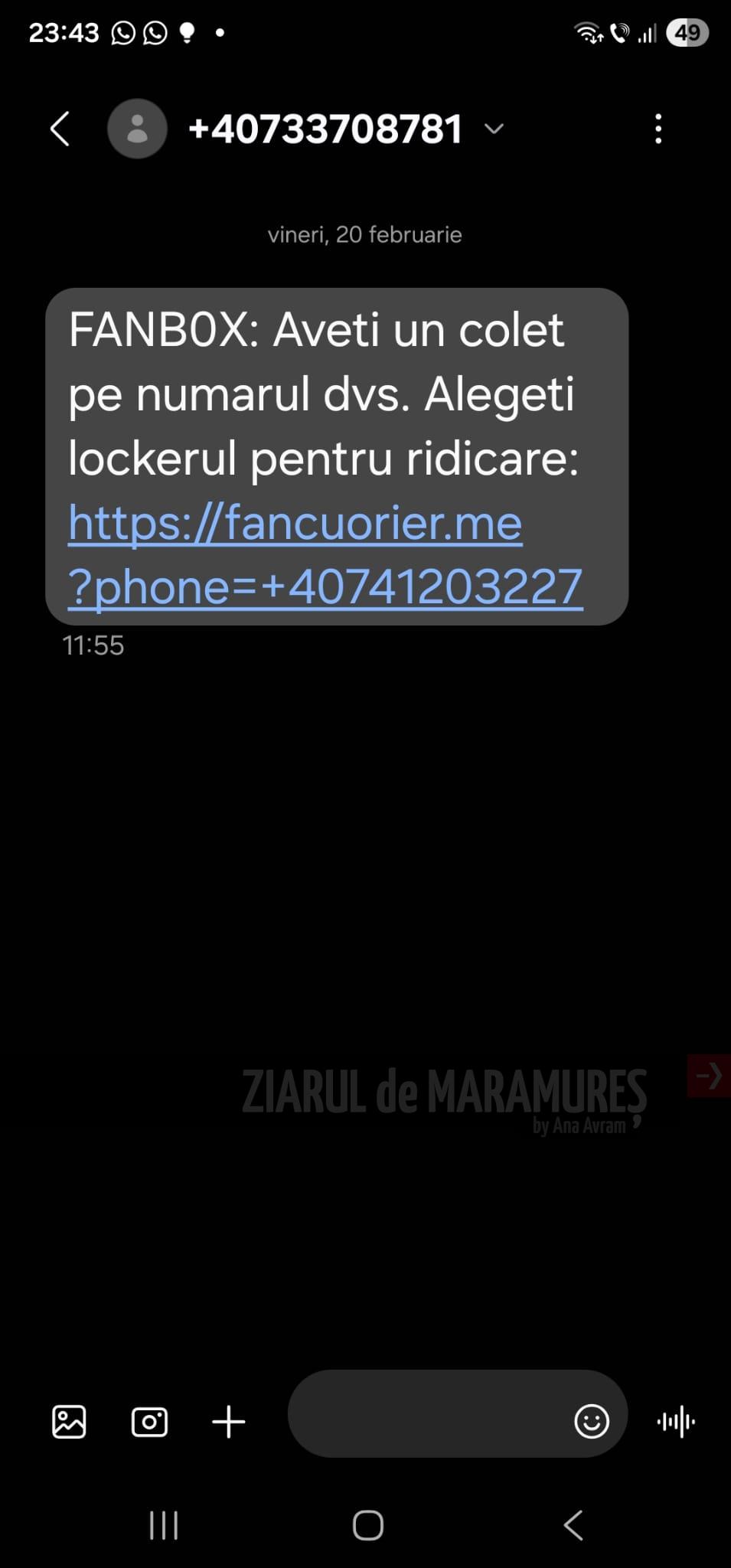 ”Asteptam un colet si am primit un link, m-am gandit ca e coletul si am primit si un cod pe care l-am introdus. Sambata m-am trezit cu telefoane si mesaje de la apropiati, cunostinte, clienti cum că le-as fi cerut ajutorul. Primul pas pe care l-am făcut a fost să sun urgent banca să blocheze conturile. Apoi se verifică rapid conexiunea cu alte duspozitive asociate. După cum se poate observa link-ul e incorect, semănând cu link-ul celor de la un curierat, dar strecurată litera ”o” in link. Iar cand ai colet de ridicat, din neatentie il accesezi instinctiv… A fost o munca de titan sa opresc platile, să anunt oamenii că mi-a fost spart contul. Intr-un final am reusit. Plus ca mi-am luat masura de protectie si pentru ce aveam in telefon. Celor care citesc ce am patit eu le spun doar atat: O clipa de neatentie poate crea haos! Fiti atenti, verificati!”, a relatat băimăreanca.