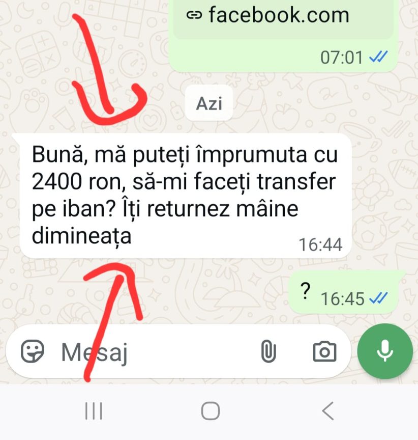 Nu este un caz singular, prin urmare venim si va atentionăm! Intr-o astfel de situatie sunati persoana de la care primiti un astfel de mesaj si intrebati-o daca apelul scris este real. Nu va grabiti să faceti plata! Si nu uitati că vă puteti adresa si politiei cu o sesizare scrisa. Cert e că, cei care au facut plata au primit conturi si date diferite, prin urmare băimăreanca a atentionat toate persoanele aflate in lista de contacte WhatsApp. Atentie să nu fiti păcăliti! Nu platiti niciodata cand primiti astfel de mesaje! Verificati! Atentie pe ce linkuri intrati si ce coduri primiti si introduceti din telefonul vostru mobil!