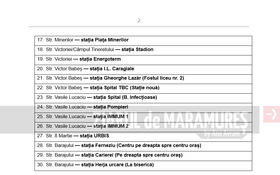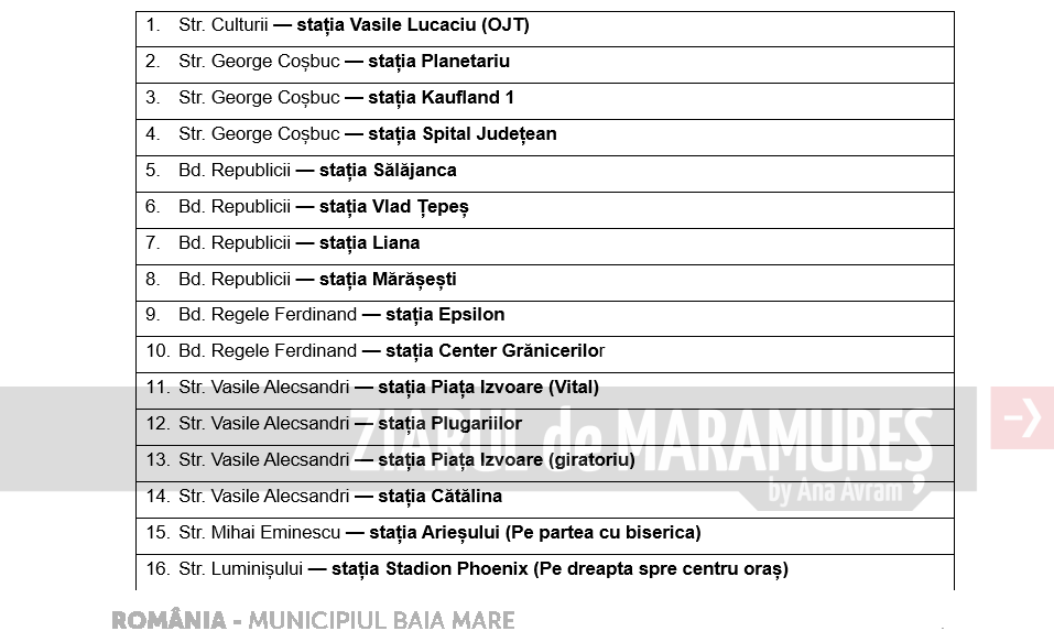 Lista celor 30 de stații de transport în comun care vor fi modernizate (nr. crt., strada, numele stației):