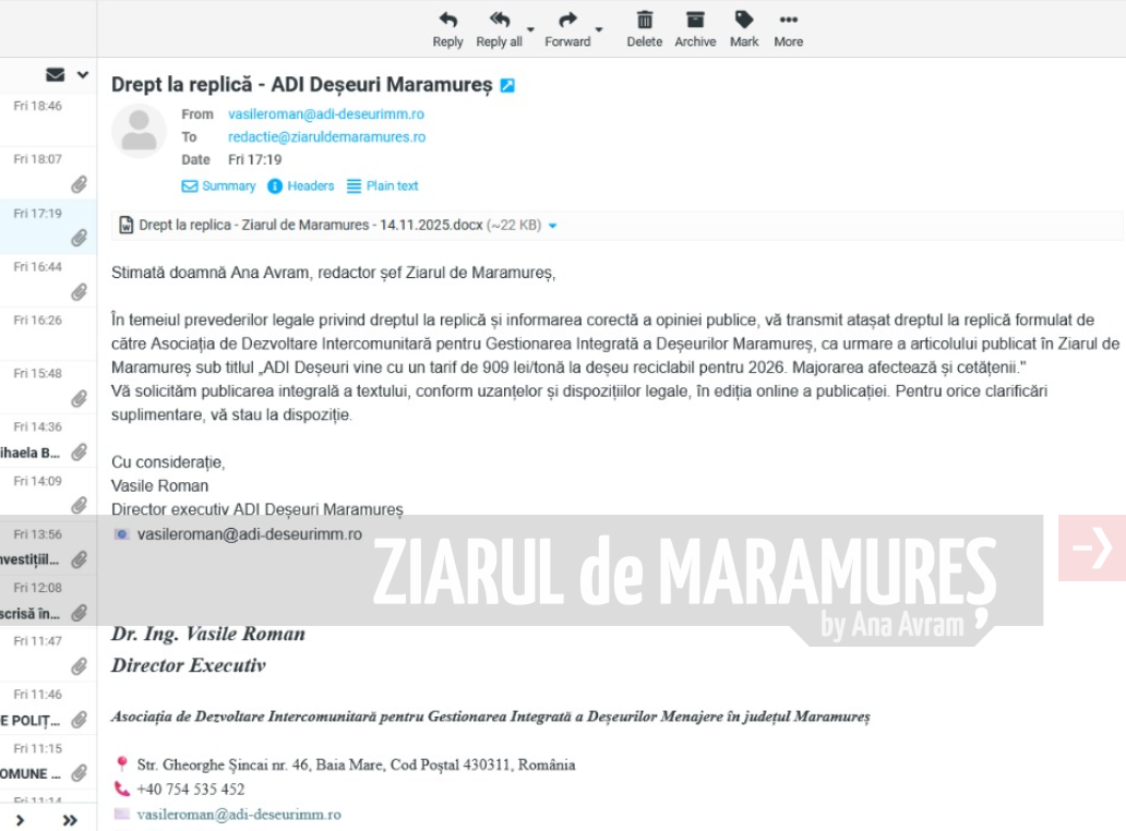ADI DEȘEURI Maramures a transmis un drept la replică la articolul publicat ieri, 15 noiembrie 2025 -CLICK!. Prin acest DREPT LA REPLICĂ se contestă practic inclusiv pozițiile primarilor si a consiliilor locale care au decis să acorde un vot nefavorabil propunerii transmise UAT-urilor în nota de fundamentare și nu doar articolului în sine, care are la bază discutiile cu primarii si nota de fundamentare.