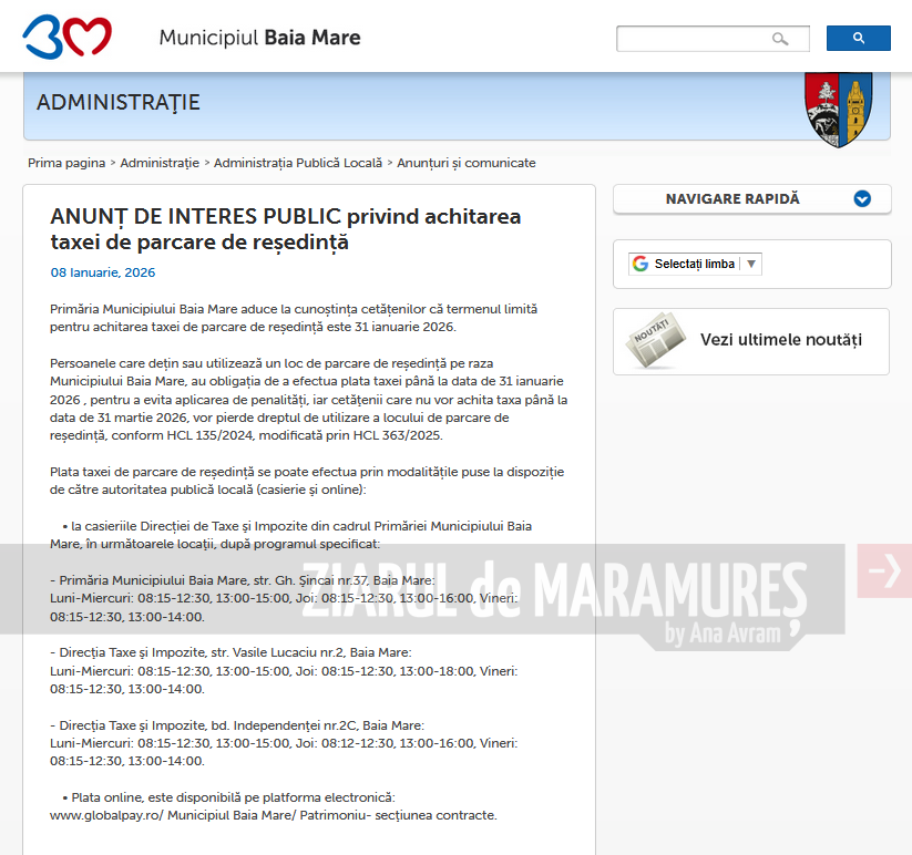 Persoanele care dețin sau utilizează un loc de parcare de reședință pe raza Municipiului Baia Mare, au obligația de a efectua plata taxei până la data de 31 ianuarie 2026, pentru a evita aplicarea de penalități. Cetăţenii care nu vor achita taxa până la data de 31 martie 2026, vor pierde dreptul de utilizare a locului de parcare de reședință, conform HCL 135/2024, modificată prin HCL 363/2025, anunță Primăria Municipiului Baia Mare.