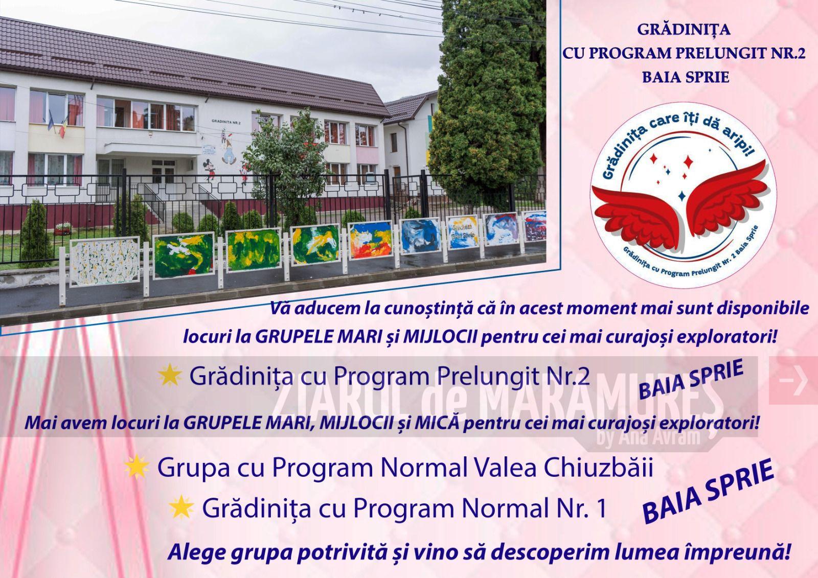 Părinții sunt așteptați să înscrie copiii la Grădinița Nr. 2 din Baia Sprie cu toată încrederea. Mai sunt locuri disponibile la grupele mari și mijlocii. Echipa grădiniței este pregătită să ofere copiilor grijă, sprijin și o mulțime de activități creative care să stimuleze curiozitatea și să dezvolte abilitățile fiecărui copil.