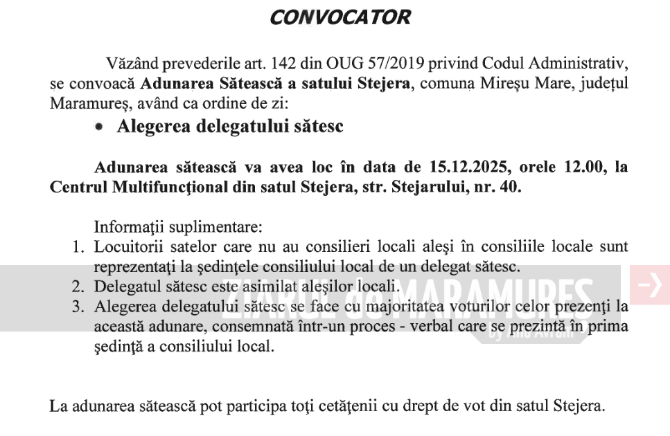 Primăria Mireșu Mare anunță convocarea Adunării Sătești a satului Stejera pentru alegerea delegatului sătesc. Adunarea va avea loc în ziua de 15 decembrie 2025, de la ora 12.00, la Centrul Multifuncțional din satul Stejera, cu sediul pe strada Stejarului numărul 40.