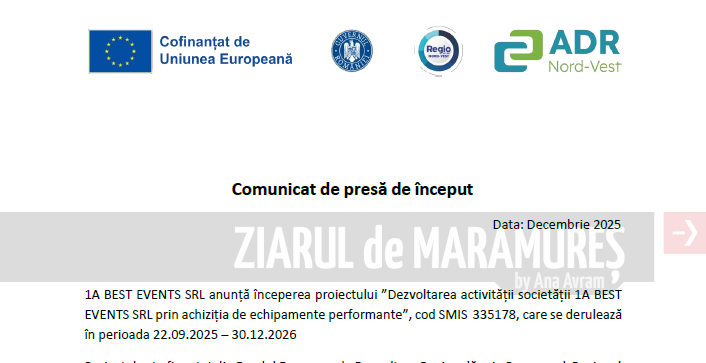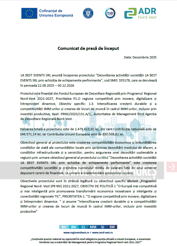 Comunicat de presă de început. 1A BEST EVENTS SRL anunță începerea proiectului ”Dezvoltarea activității societății 1A BEST EVENTS SRL prin achiziția de echipamente performante” - Ziarul de Maramures
