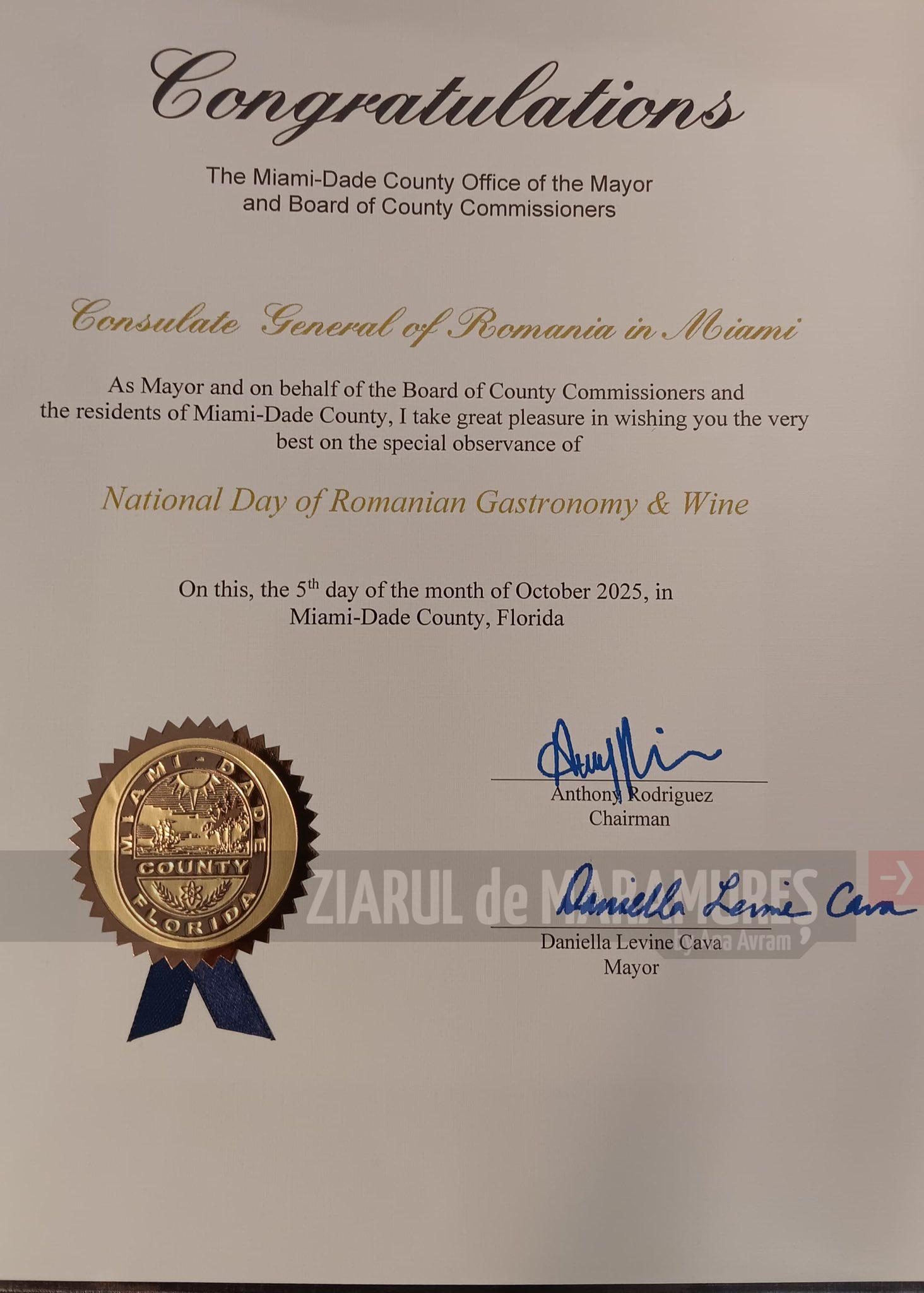 Consulatul General al României la Miami a celebrat Ziua Națională a Gastronomiei și Vinului Românesc, alături de peste 150 de invitați – oficiali locali, membri ai corpului consular, reprezentanți ai mediului de afaceri și ai Camerelor de Comerț, precum și membri ai comunității românești.