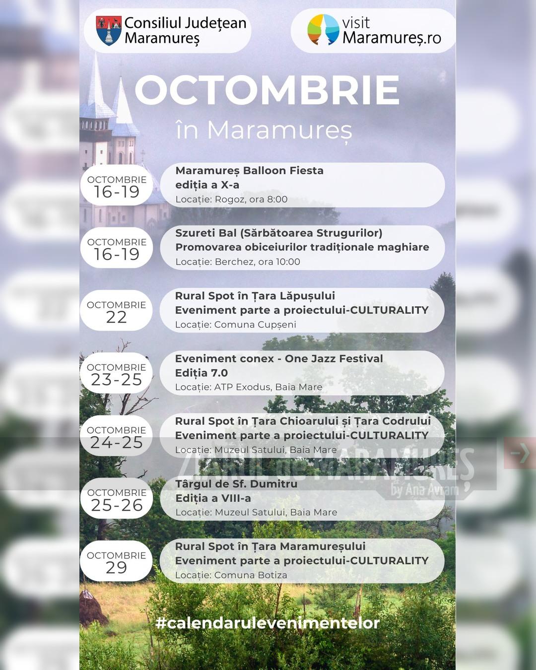 Octombrie continuă în Maramureș cu o serie de evenimente pline de culoare și voie bună, care celebrează tradițiile locale, muzica, meșteșugurile și comunitățile din toate colțurile județului.