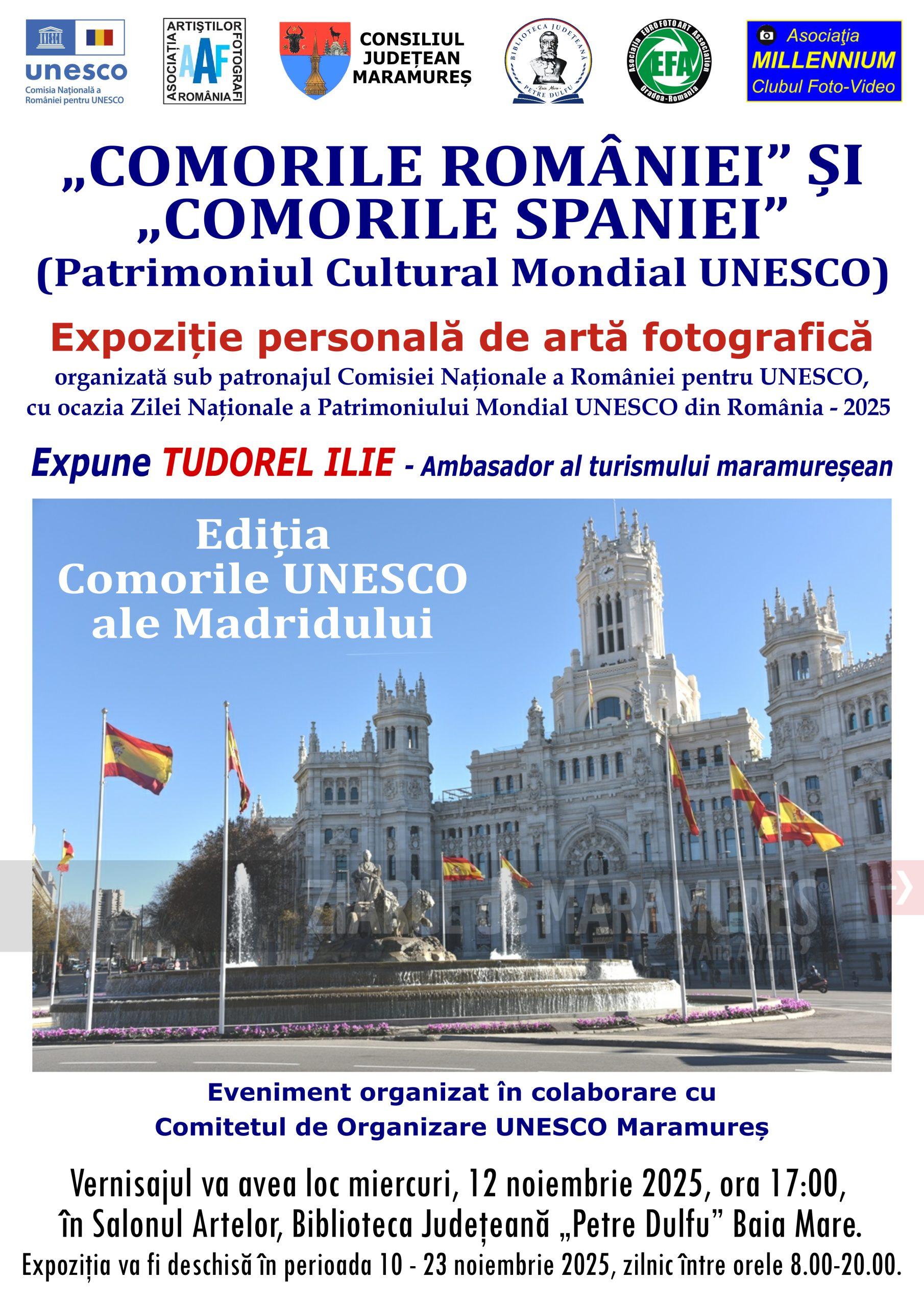 Vernisajul-eveniment de lansare a expoziției „Comorile României” și „Comorile Spaniei” ( ediția „Comorile UNESCO ale Madridului” ) va avea loc miercuri 12 noiembrie 2025, de la ora 17.00, în „Salonul Artelor” de la Biblioteca Județeană „Petre Dulfu” din Baia Mare. Cu acest prilej se va sărbători Ziua Națională a Patrimoniul Mondial UNESCO din România 2025 (16 noiembrie anual ).