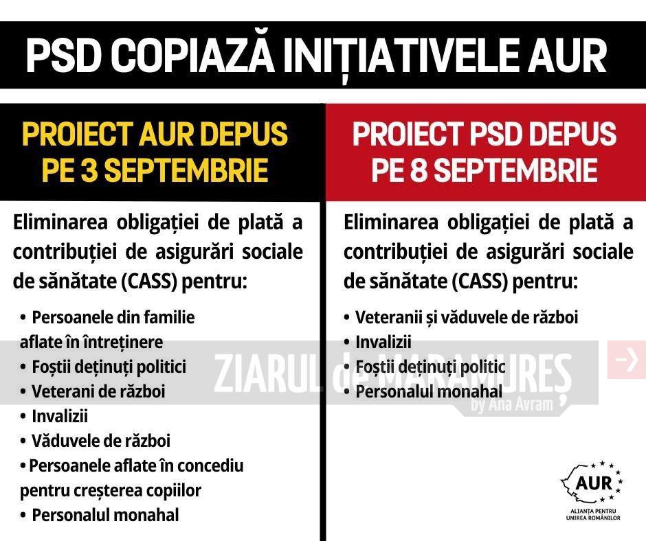 „AUR își menține angajamentul de a apăra aceste categorii vulnerabile și de a elimina povara CASS impusă pe nedrept. Ne bucurăm că PSD recunoaște justețea inițiativelor noastre, dar nu e suficient să copieze și să mimeze opoziția față de austeritate. Vrem fapte! Îi îndemnăm să dovedească în Parlament că nu e doar teatru și să voteze pentru această măsură, fie că e proiectul nostru sau al lor. Important este ca persoanele vulnerabile să fie protejate”, a mai spus Ciornei.