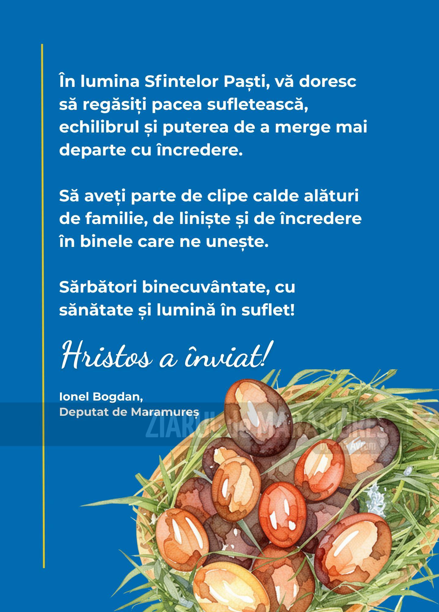 În lumina Sfintelor Paști, vă doresc să regăsiți pacea sufletească, echilibrul și puterea de a merge mai departe cu încredere. Să aveți parte de clipe calde alături de familie și de încredere în binele care ne unește.