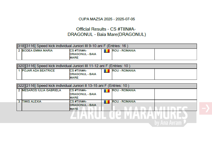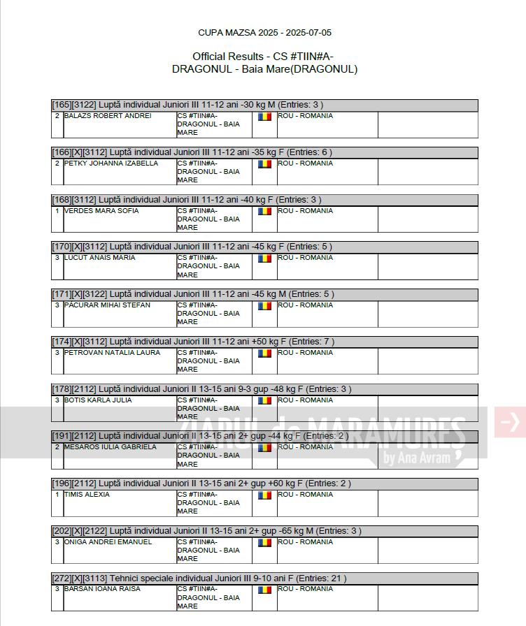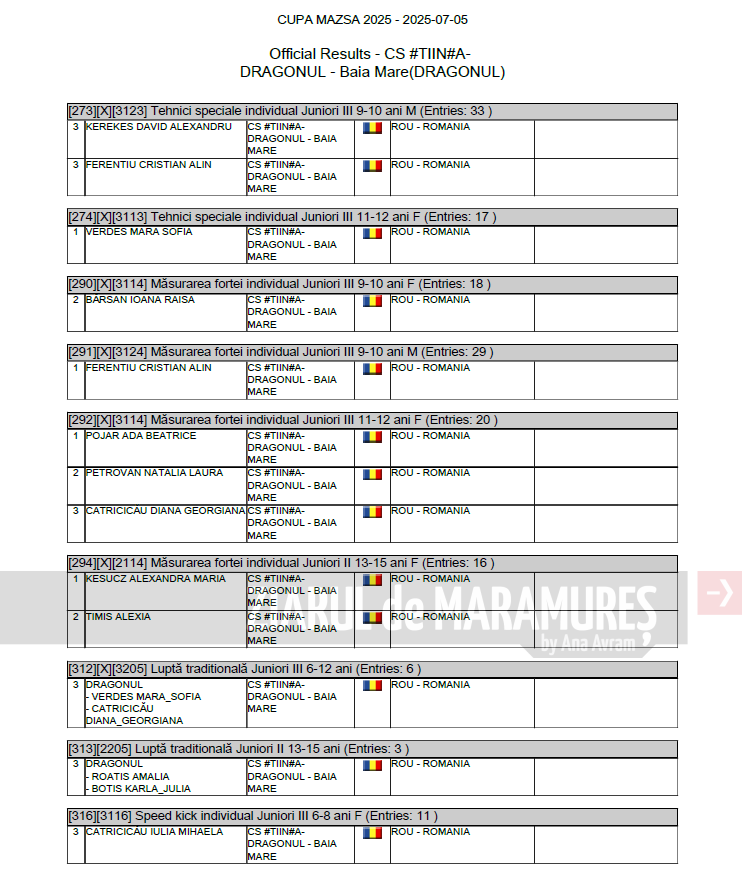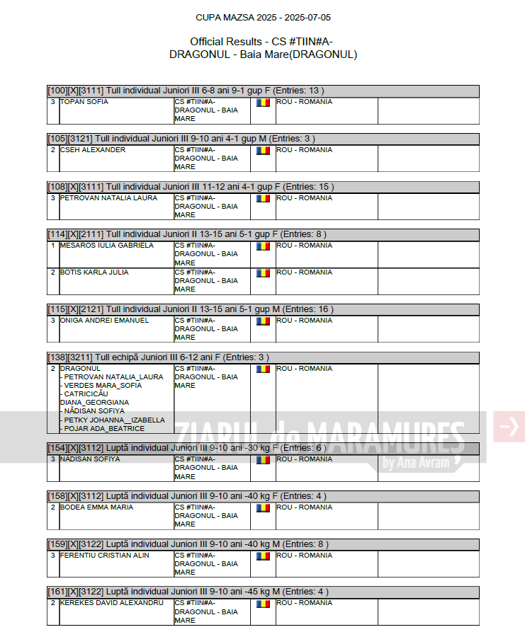 ”Echipa CS Știința – Dragonul Baia Mare a fost prezentă în forță la una dintre cele mai bine organizate competiții ale sezonului, găzduită la Sala Sporturilor „Horia Demian” din Cluj-Napoca. Competiția a fost organizată de ACS Delta M.M.A. Academy – Cluj-Napoca, împreună cu Federația Română de Taekwon-do ITF, reunind 334 de sportivi de la 22 de cluburi din întreaga țară. Lotul nostru a fost format din 39 de sportivi, însoțiți de 7 instructori, 4 arbitri și – ca de obicei – de cei mai fideli și implicați susținători: părinții! După o zi intensă de competiție, ne-am întors acasă cu un palmares de 39 de medalii, care reflectă munca, seriozitatea și progresul sportivilor noștri.Mulțumim întregii echipe tehnice, arbitrilor și părinților pentru implicare și susținere, împreună formăm caractere și campioni”, a precizat Dan Goron, 6 DAN, antrenor emerit.