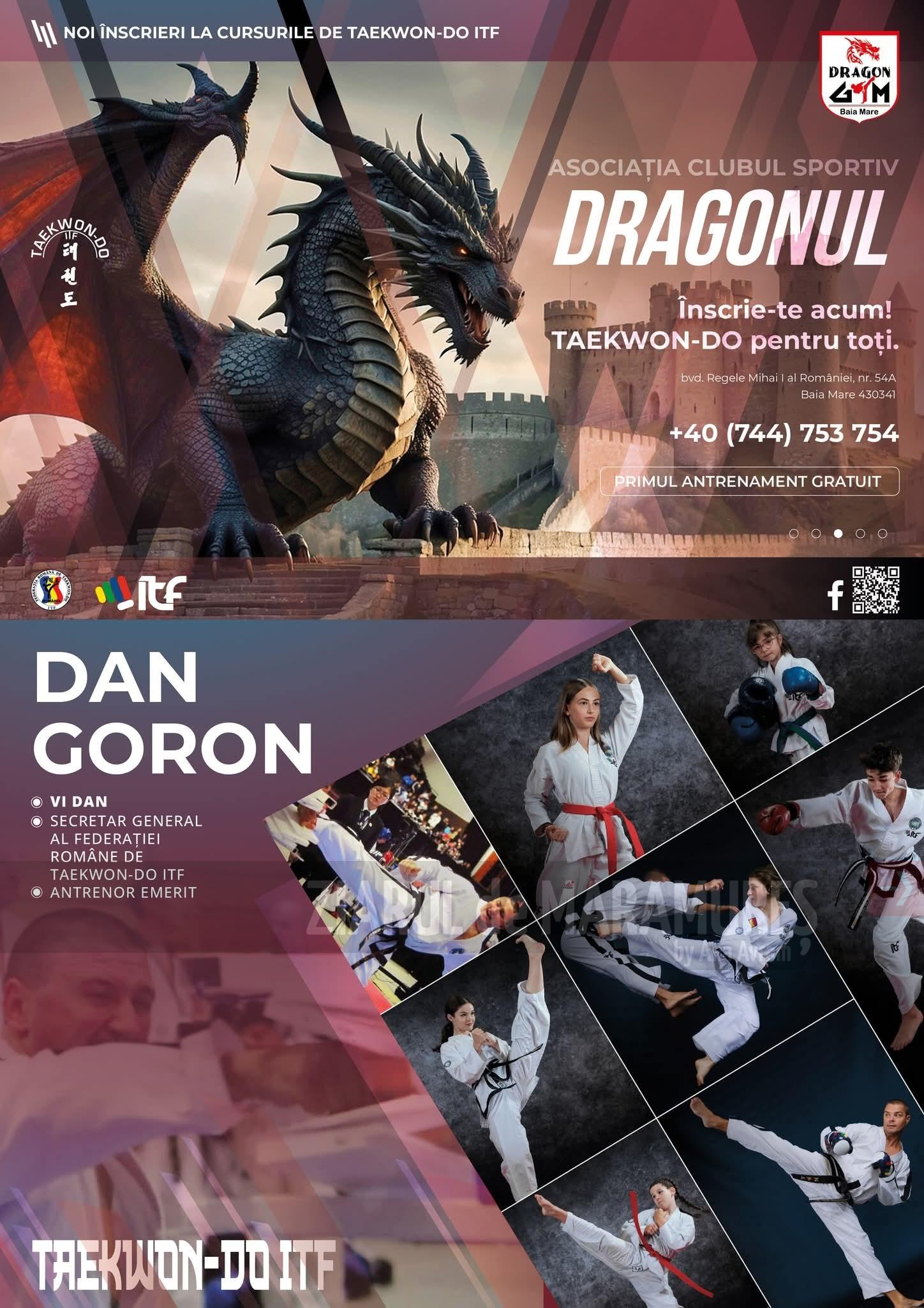 CS DRAGONUL Baia Mare își deschide larg ușile de la sala de antrenamente pentru toți iubitorii de sport. Prin urmare cei care doriți să îl cunoașteți pe antrenorul emerit Dan Goron, 6 DAN Taekwon-do ITF, dar și echipa de antrenori și campioni, nu trebuie să faceți altceva decât să treceți pragul sălii fie în 20 august 2025, fie în 22 august 2025.