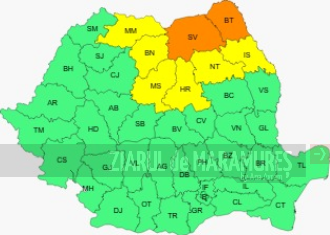 În nord-estul Transilvaniei și local în Maramureș și în nordul Moldovei vor fi perioade cu instabilitate atmosferică ce se va manifesta prin averse torențiale, descărcări electrice, intensificări ale vântului (rafale de 50…60 km/h) și izolat grindină. În intervale scurte de timp sau prin acumulare, cantitățile de apă vor fi de 15…20 l/mp și izolat de peste 30 l/mp.