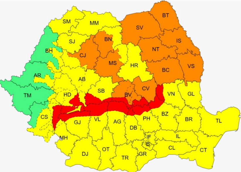 Cod GALBEN de ninsoare în Maramureș, Transilvania, Moldova și Dobrogea; interval de valabilitate: 28 decembrie, ora 10.00 – 29 decembrie, ora 10.00.
